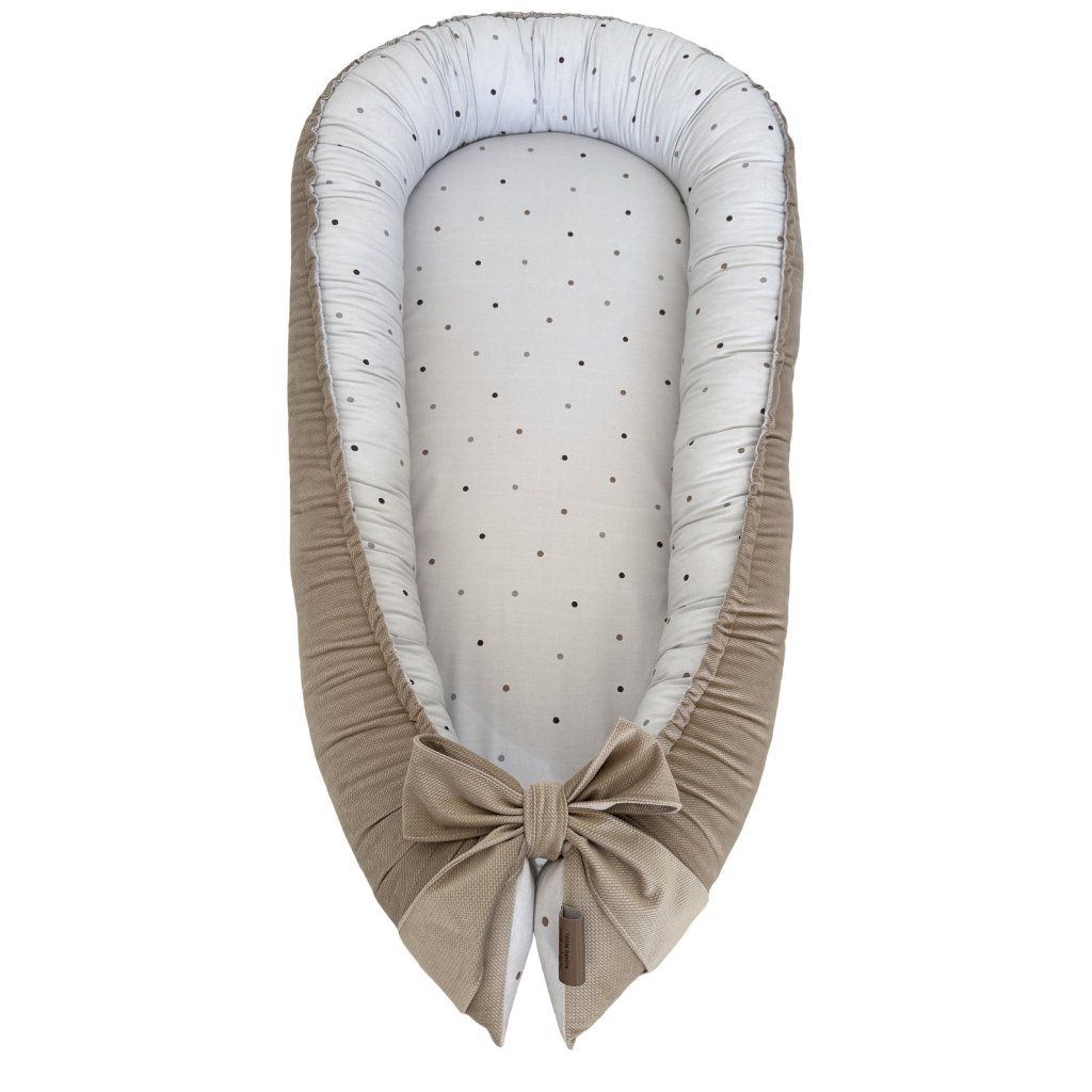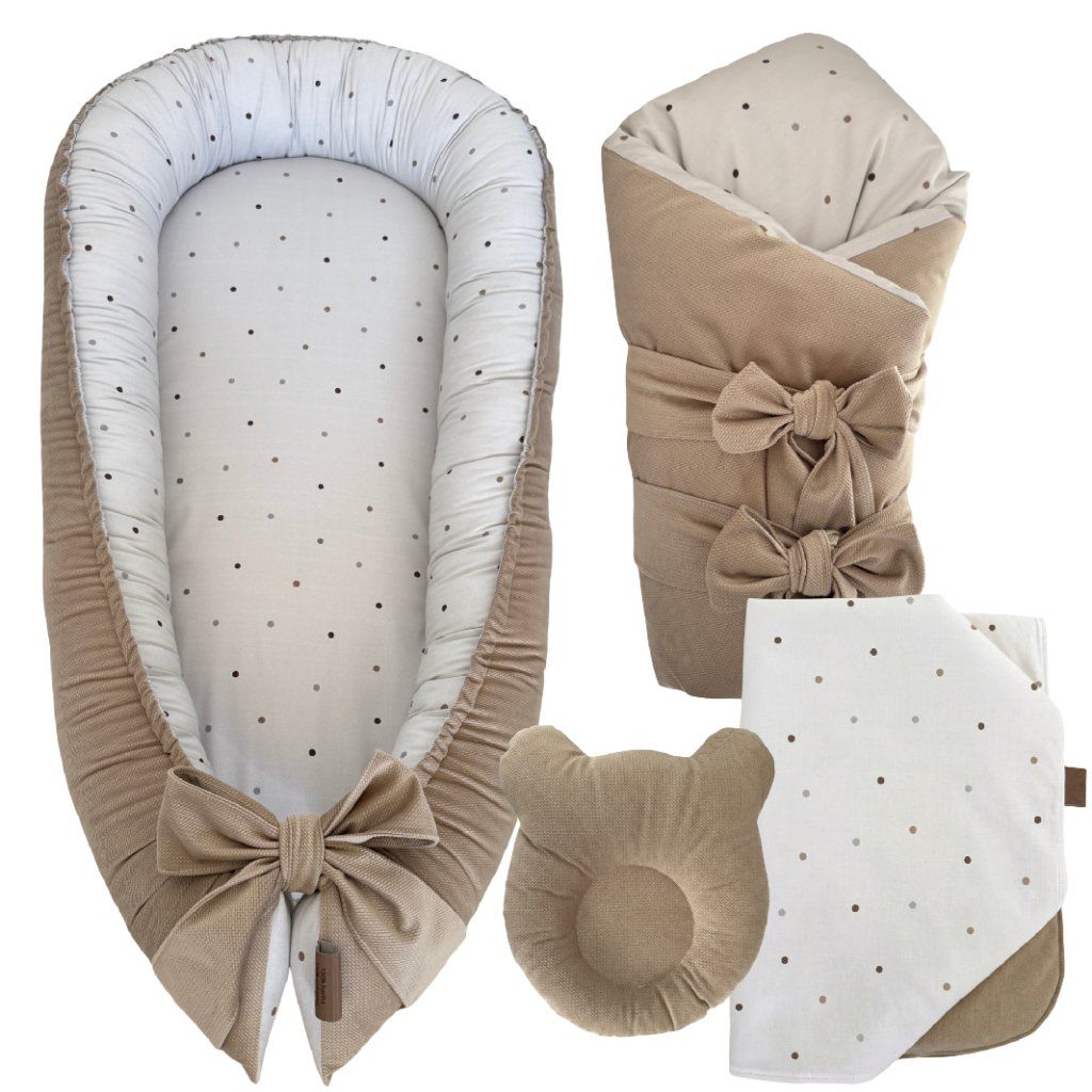 Set do postieľky Nude dots v elegantnom neutrálnom dizajne spája tri nevyhnutné prvky pre pohodlný spánok vášho bábätka - kvalitné hniezdo, praktickú zavinovačku a vankúš proti preležaniu. Tento set vyrobený z kombinácie jemného velvetu a kvalitnej bavlny poskytuje vysoký komfort, bezpečie a štýl od prvých dní života vášho dieťatka.