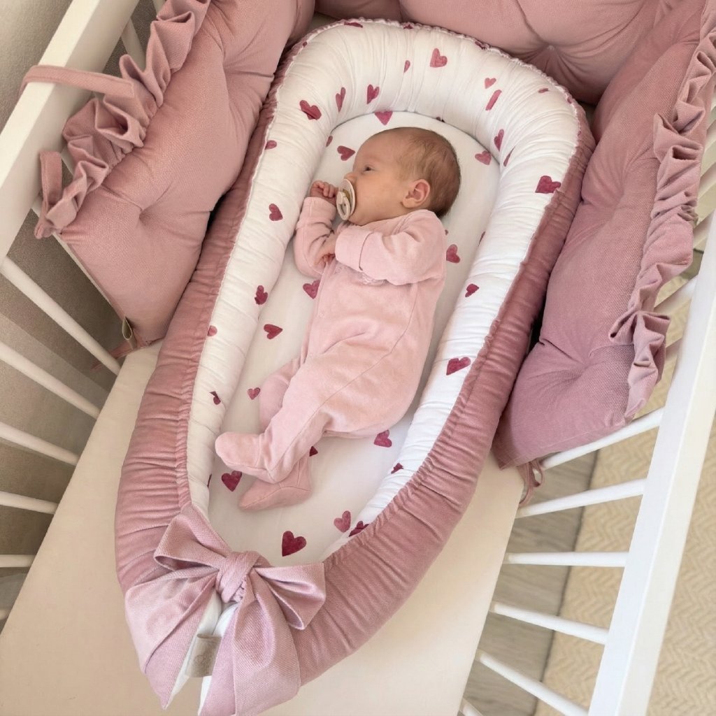 Detské hniezdo Malinové srdiečka je praktickým prvým domovom pre vaše bábätko, ktorý kombinuje bezpečnosť, komfort a príjemný dizajn. Doprajte vášmu maličkému kvalitný spánok v hniezde do postieľky, ktoré rastie spolu s ním a stane sa neodmysliteľnou súčasťou jeho prvých mesiacov života.