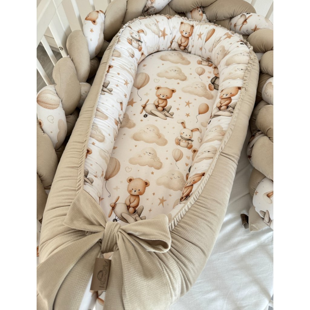 Hniezdo pre bábätko chlapec s motívom Medvedíka v lietadle poskytuje vášmu dieťatku pocit bezpečia a komfortu počas prvých mesiacov života. Tento praktický a estetický doplnok do postieľky nielen zabezpečuje pohodlie, ale vďaka roztomilému dizajnu s lietajúcim medvedíkom dodá detskej izbe jedinečný charakter. Ľahké a navrhnuté pre bezpečné prenášanie, hniezdo pre chlapca zabezpečí, že dieťa bude mať známe prostredie kdekoľvek v domácnosti.