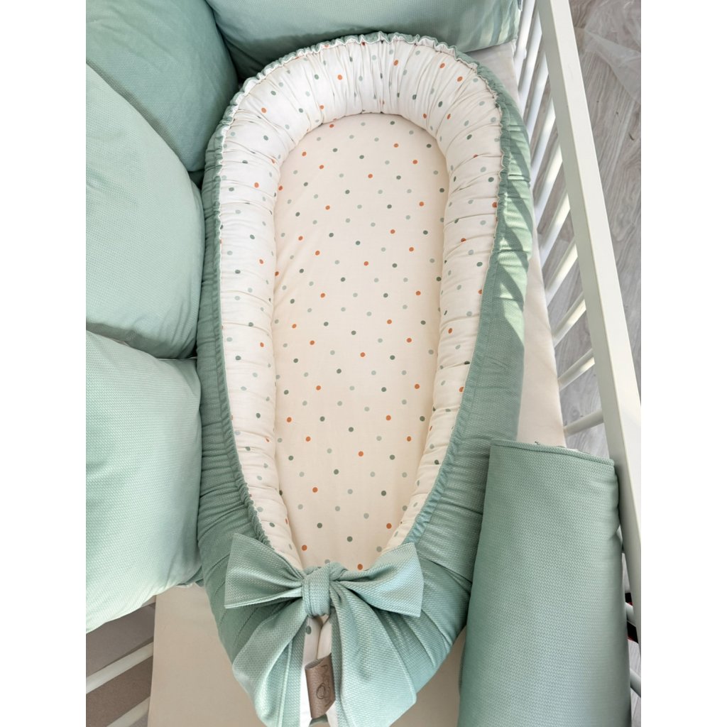 Hniezdo pre dievčatko s farebnými bodkami a šalviovou farbou vytvára pre vaše bábätko príjemné a bezpečné prostredie, ktoré simuluje pocit obklopenia podobný tomu, na ktorý bolo zvyknuté pred narodením. Tento ručne šitý, certifikovaný pomocník poskytuje útulný priestor pre spánok a oddych vášho dievčatka, či už doma, na návšteve alebo na cestách. Doprajte svojmu pokladu maximálne pohodlie v prvých mesiacoch života!