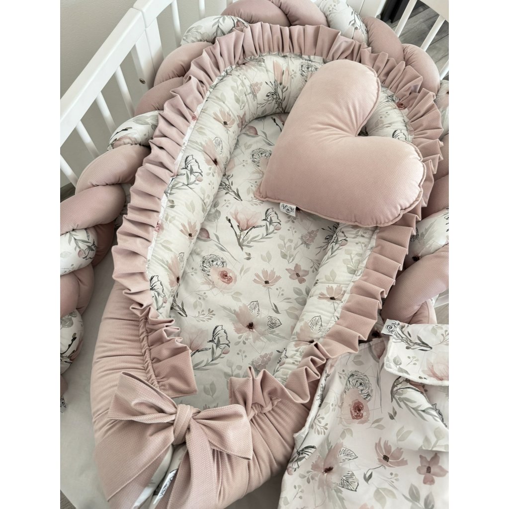 - Kompletné hniezdo s jemným kvetinovým dizajnom a volánom