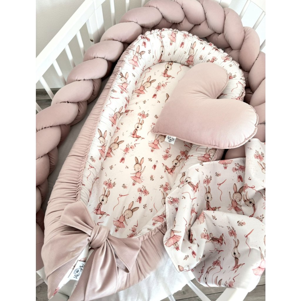 Hniezdo pre dievčatko Zajačik baletka vytvára útulné miesto, ktoré vášmu bábätku pripomína pocit objatia a bezpečia. Poskytuje mu chránený priestor na spánok, oddych aj maznanie - či už doma, na návšteve alebo na cestách. Ručne šité z kvalitných materiálov, jemne obopne telíčko vášho dievčatka a doprajú jej maximálne pohodlie v prvých mesiacoch života.