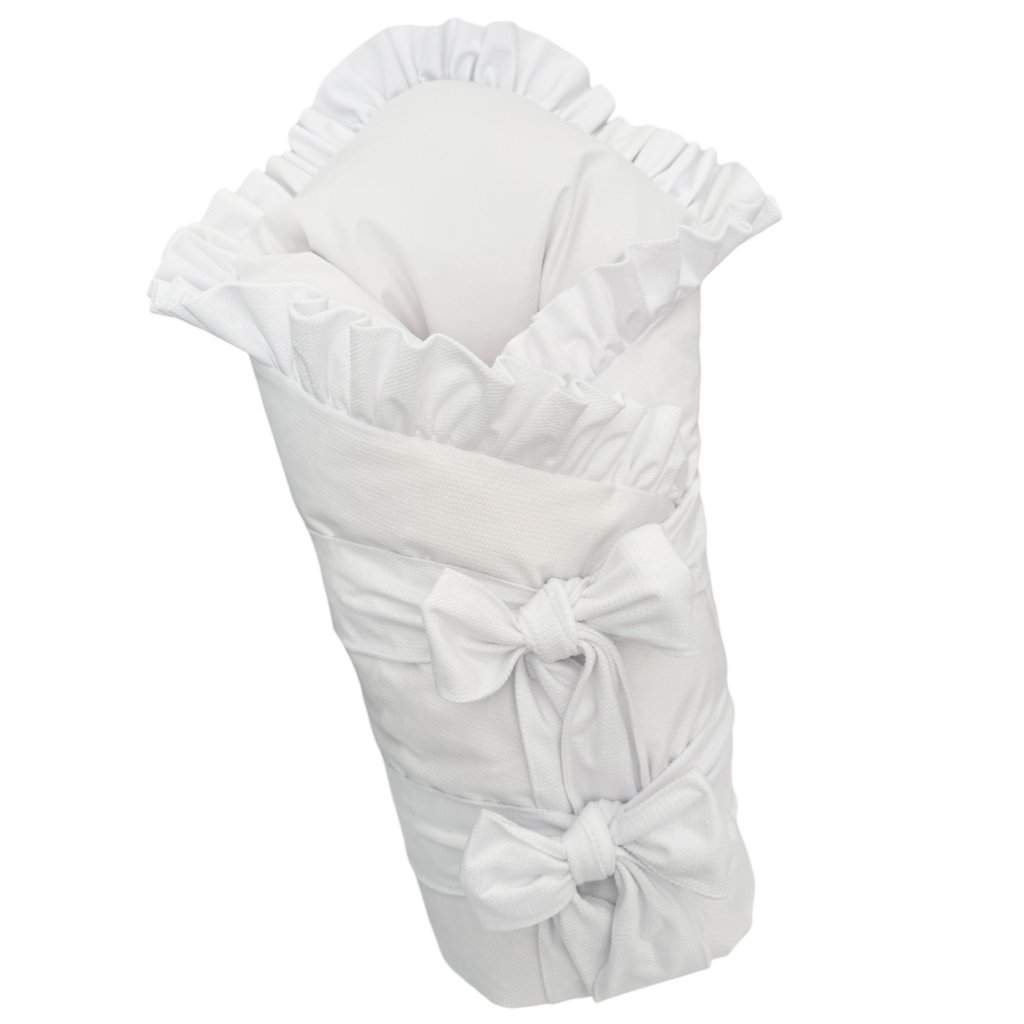 Luxusná biela krstová zavinovačka s volánom spája elegantný dizajn s praktickosťou, čím dodáva každému krstnému obradu osobitý štýl. Táto prémiová zavinovačka kombinuje nežný, slávnostný vzhľad s maximálnym pohodlím pre vaše bábätko. Jemný volán a elegantné viazanie na dve mašle vytvárajú dokonalý rámec pre vášho malého anjelika počas významnej rodinnej udalosti.