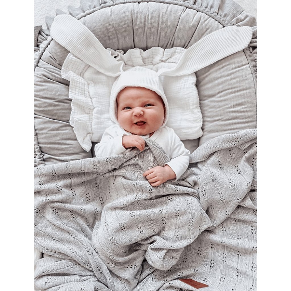 Pletená bambusová deka v sivom prevedení spája prírodné vlastnosti s praktickým využitím. Jemná textúra poskytuje maximálny komfort citlivej detskej pokožke. Tento štýlový kúsok s elegantným vrkočovým vzorom sa stane nenahraditeľnou súčasťou výbavy vášho bábätka - od prvých dní v pôrodnici až po každodenné prechádzky v kočíku.