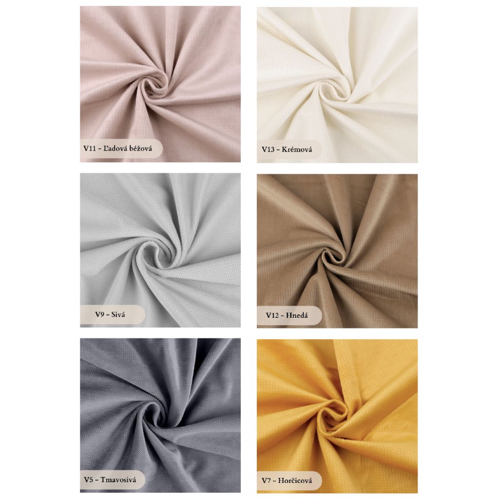 Farby velvet látky je možné nájsť pri produktových obrázkoch alebo vo vzorkovníku látok.