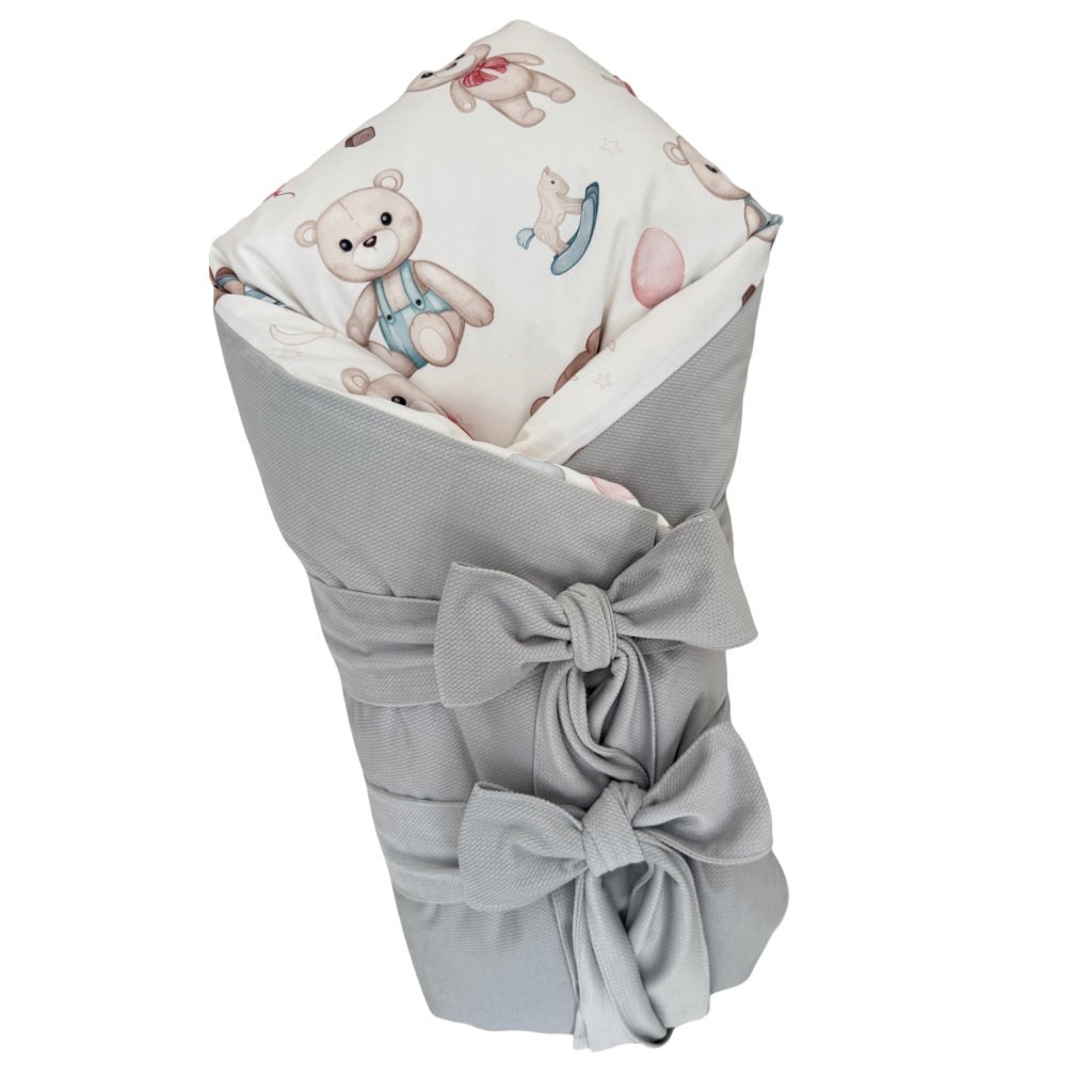 Položte zavinovačku na rovný povrch, umiestnite bábätko do stredu, preložte spodnú časť cez nožičky, potom ľavú stranu cez telo a nakoniec pravú stranu. Zaviažte mašle tak, aby boli pevné, ale nie príliš tesné.