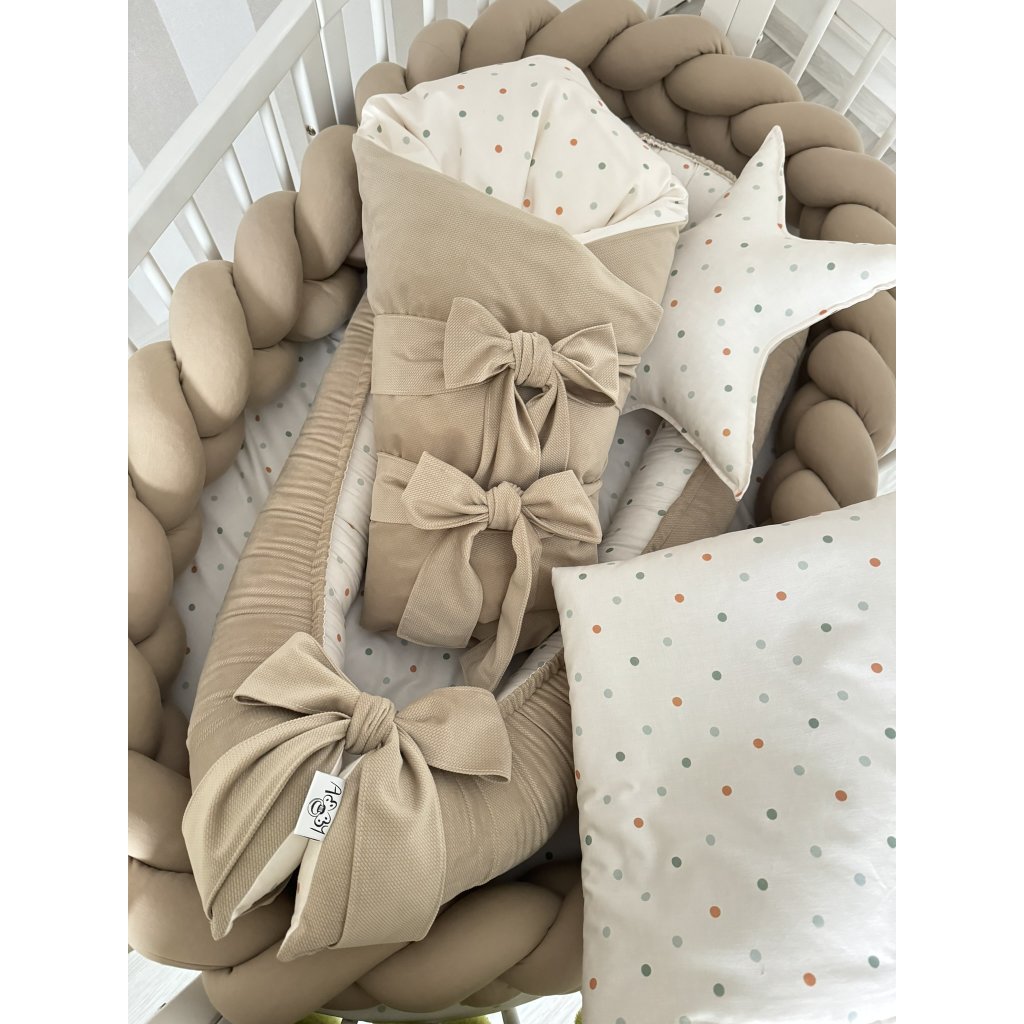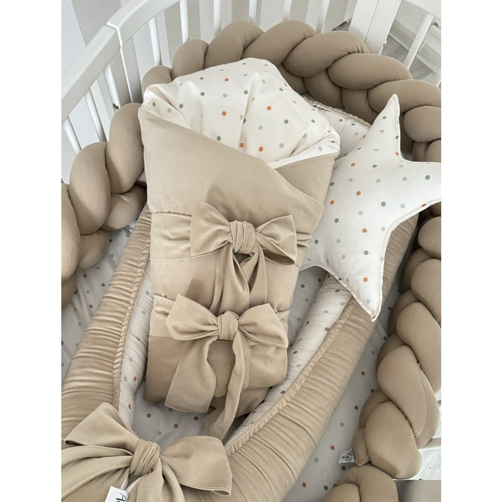 Set do postieľky 3v1 predstavuje praktické a ucelené riešenie pre rodičov, ktorí hľadajú kvalitné vybavenie pre svojho novorodenca. Kombinácia hniezda, zavinovačky a deky poskytuje všetko potrebné pre vytvorenie bezpečného a príjemného prostredia pre bábätko v jednom balení. Jednotný dizajn farebných bodiek na tmavej béžovej dodáva celému setu elegantný vzhľad, ktorý sa hodí do akejkoľvek detskej izby.