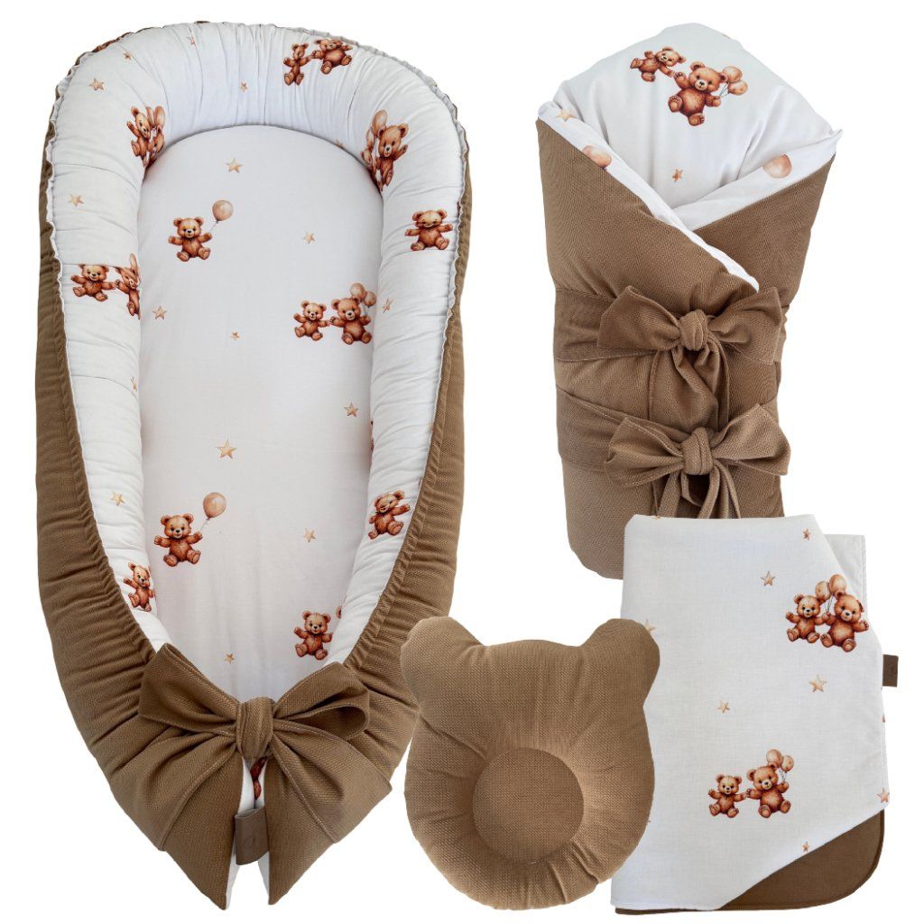 Set do postieľky s motívom hnedého medvedíka predstavuje praktické a kvalitné riešenie pre vybavenie detskej postieľky. Vďaka kombinácii hniezda, zavinovačky a deky získate všetko potrebné pre komfortný spánok vášho bábätka v jednom balení so zosúladeným dizajnom.