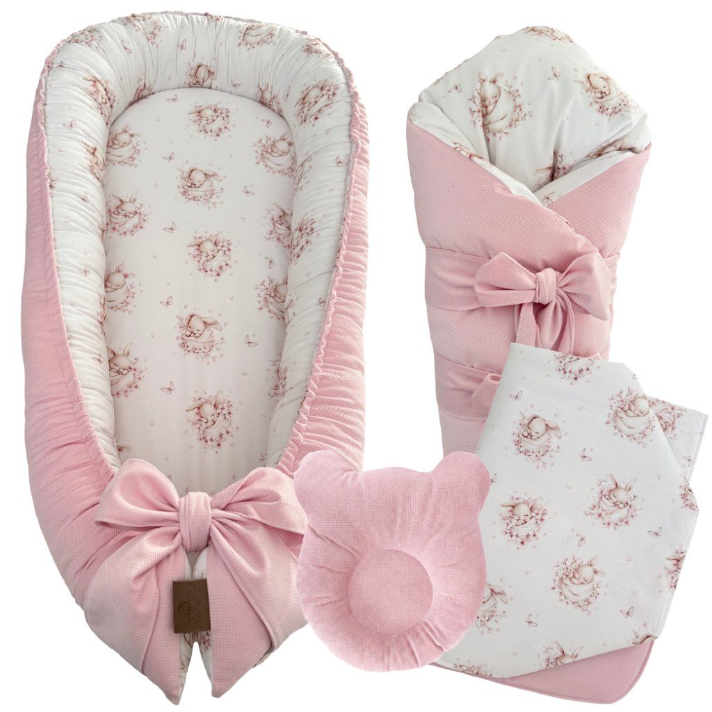 Set do postieľky Sladký zajačik ponúka bezpečný a pohodlný spánok pre vaše bábätko. S multifunkčným hniezdom, zavinovačkou, mäkkou dekou a vankúšikom proti preležaniu hlavičky zabezpečíte ideálne prostredie pre jeho zdravý vývoj.