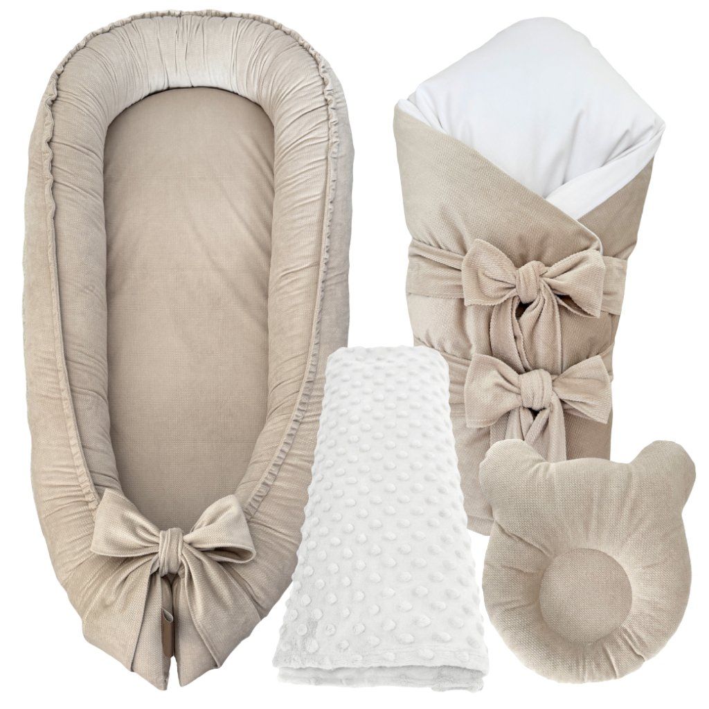 Set do postieľky 4v1 v béžovom velvete s bielymi detailmi prináša vášmu bábätku bezpečie a pohodlie v jednom balení. Tento praktický set kombinuje štyri základné prvky detskej výbavy - ochranné hniezdo, upokojujúcu zavinovačku, hrejivú minky deku a vankúš proti preležaniu hlavičky. Všetko v nadčasovej béžovo-bielej kombinácii, ktorá sa hodí do každého interiéru a poskytuje vášmu maličkému potrebný komfort a ochranu.