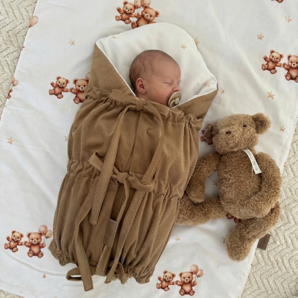 Šnurovacia zavinovačka Hnedý medvedík poskytne vášmu bábätku pocit bezpečia a istoty, ktorý pozná z mamičkinho bruška. Táto zavinovačka pre chlapca s originálnym dizajnom hnedého medvedíka predstavuje štýlovú alternatívu k tradičným zavinovačkám. Vďaka premyslenej konštrukcii s troma samostatnými časťami a certifikovaným materiálom OEKO-TEX 100 je nielen štýlovým, ale aj maximálne praktickým doplnkom, ktorý využijete aj po tom, čo z nej vaše bábätko vyrastie.