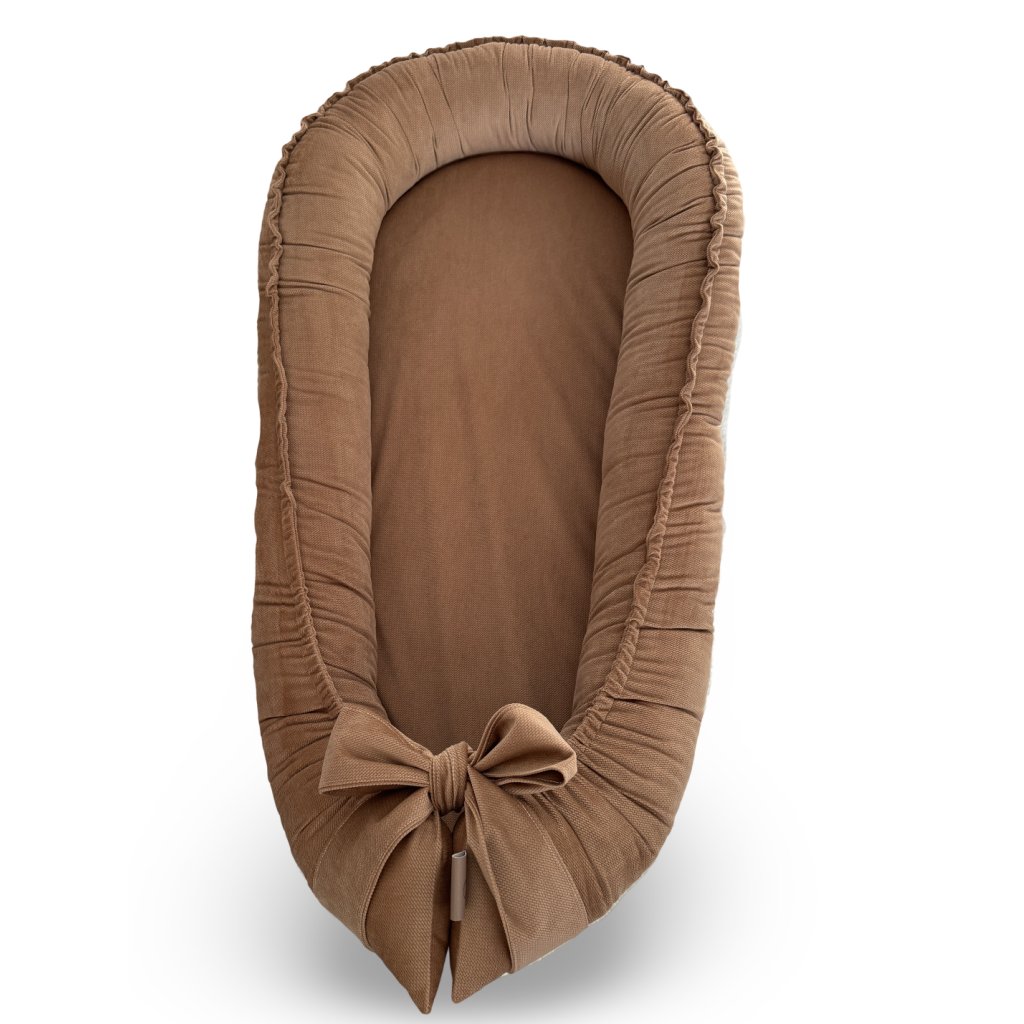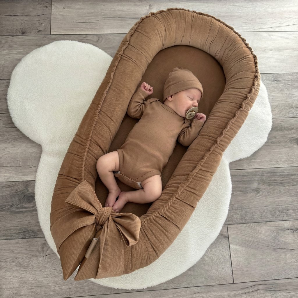 Útulné Velvet Hniezdo pre Bábätko - Bezpečný Prístav Pohodlia v Hnedej Farbe